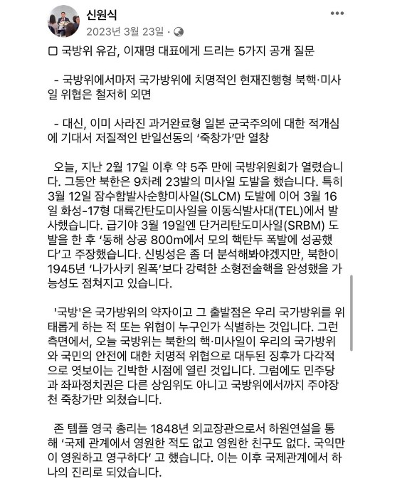 신 장관은 국민의힘 소속 의원으로 활동하던 지난해, 북한의 연이은 미사일 도발에 대응하는 차원에서 SNS에 더불어민주당을 향해 강한 어조로 비판을 가하면서 한일 간의 역사적 갈등 문제를 위와 같이 언급했습니다.