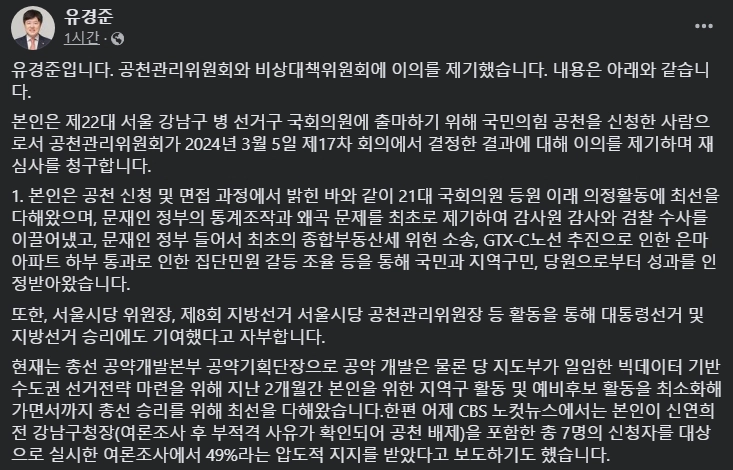 이에 대해 유 의원은 공천관리위원회와 비상대책위원회에 재심사를 청구했다고 6일 자신의 페이스북을 통해 밝혔습니다.