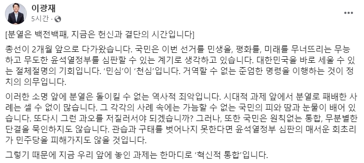 이 전 총장은 SNS를 통해 분열은 실패를 불러온다며, 현재는 헌신과 결단이 필요한 시기라고 강조했습니다.